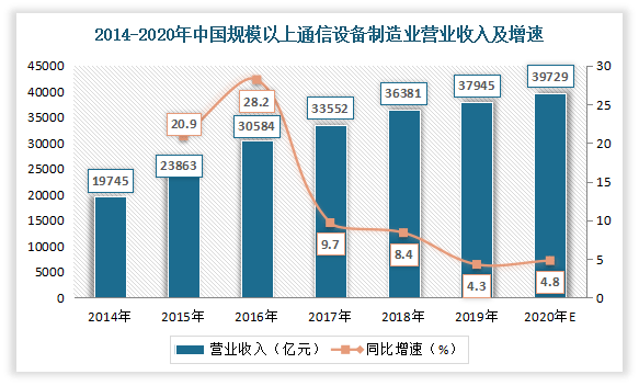 受益于下游應(yīng)用場景十分廣泛,與國民經(jīng)濟發(fā)展密切相關(guān),近年來隨著我國經(jīng)濟持續(xù)增長,市場對通信電纜的需求持續(xù)上升,帶動我國通信電纜行業(yè)規(guī)模不斷擴大。同時在需求的拉動下,我國通信電纜生產(chǎn)技術(shù)不斷進步,產(chǎn)品種類日益豐富,基本可以滿足國內(nèi)市場需求。我國已經(jīng)成為全球通信電纜生產(chǎn)大國。根據(jù)工信部,2020年,通信設(shè)備制造業(yè)營業(yè)收入同比增長4.7%,則通信設(shè)備制造業(yè)營業(yè)收入初步估計達39729億元。