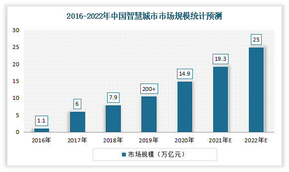 近年來隨著我國穩(wěn)定的經(jīng)濟增長及技術(shù)水平的提高,智慧城市市場規(guī)模日益擴大。根據(jù)中國智慧城市工作委員會數(shù)據(jù),2020年我國智慧城市市場規(guī)模將達14.9萬億元。預(yù)測到2022年,我國智慧城市市場規(guī)模將達到25萬億元。