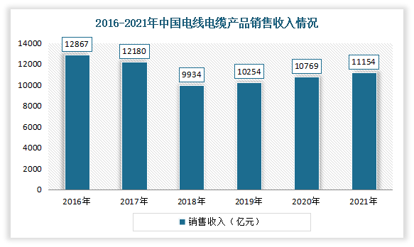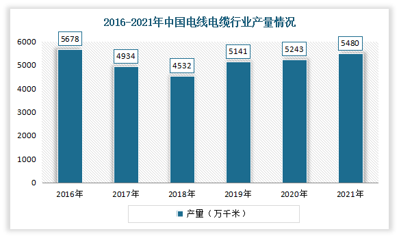電線電纜行業(yè)是我國經(jīng)濟第二大的配套產(chǎn)業(yè),僅次于汽車產(chǎn)業(yè),年市場規(guī)模超萬億。近年來隨著電力、城市軌道交通、汽車等行業(yè)快速發(fā)展以及規(guī)模不斷擴大,特別是電網(wǎng)改造加快、特高壓工程相繼投入建設(shè),我國電線電纜行業(yè)市場不斷發(fā)展。有相關(guān)數(shù)據(jù)顯示,2021年我國電線電纜產(chǎn)量約為5480萬千米,同比增長4.5;相關(guān)產(chǎn)品總銷售收入為11154億元,同比上漲3.6%。