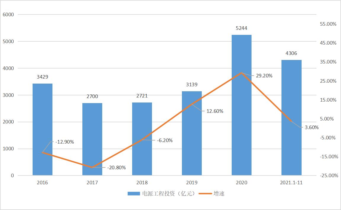 國家能源局發(fā)布的2021年1-11月份全國電力工業(yè)統(tǒng)計數(shù)據(jù)顯示,1-11月份,全國主要發(fā)電企業(yè)電源工程完成投資4306億元,同比增3.6%。其中,電網(wǎng)工程完成投資4102億元,同比增長4.1%